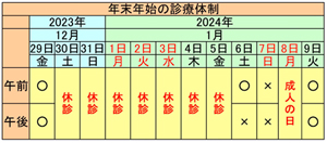 当院診療は年内12月30日午前まで、年始は1月7日より開始となります。なお、2025年より午後の診療受付時間が変更となります。ご確認のほど、よろしくお願いいたします。