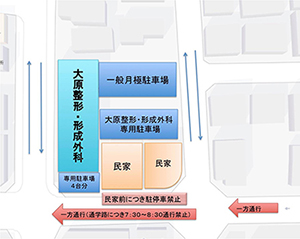 当院専用駐車場は建物南側と東側にありますが、南側駐車場前面道路は平日、土曜7時30分〜8時30分は通学路につき車輌通行止であり、違反車両は警察の指導対象となります。